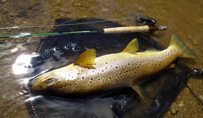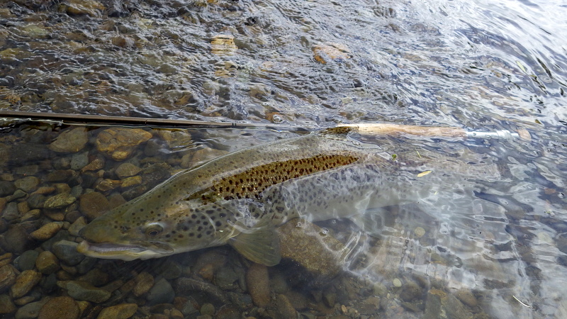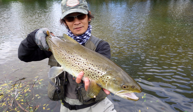 Fly Fishing 2014/11/17 Successful Weekend with Some Bad Luck 先週は久しぶりにいい魚も捕れたし、例のターゲット、「アイツ」の存在も気になるので、また同じ川へ。 まず先週の釣行で、数匹のブラウンがいたエントリーポイントからすぐのポイントを観察。デカイのがランディング寸前で肉切れでフックアウトしてしまった場所です。 おっ、今日も1匹いるな。 先週デカイのが2匹居て、1匹バラシてもう1匹はバイトしなかった。 たぶんあのもう1匹のヤツだな。 手前の浅瀬に乗っかってエサを探している様子。 これはチャンスだ! 今日もドライ&ニンフをセットアップして、慎重に近づいてアプローチします。 2投で仕留めました! してやったり。いきなり朝一からビッグブラウンを捕獲。 6lb、65cmのナイスワン。 コイツはシーランぽい色だな。先週バラシた方はもっと黄色いヤツだった。 この後、先週6.5lbをキャッチしたポイントにも50cmクラスのが2~3本いたものの、フライを見切られ、次はアイツの棲家のポイントへ。 またいるいる。 でも今日は1匹じゃない。もう2~3匹いるじゃないか。 魚が増えたようだ。 アイツの他に、ほとんど同じくらいのがもう1匹と、一回り小さいのが2匹いるようだ。 一回り小さいといっても65cmくらいはあるだろう。 やはりアイツはひと際デカイ。70cmくらいあるんじゃないか? ただ魚の数が増えて、少し動きが変わってしまった。 クルーズしてるけど、パクパクとエサを喰っている状態ではない。 フライを見つけて何回もスーッと寄ってきて、フライと交錯するんだけど、どうしても口を開かない。 けっこう長いこと、たぶん2時間以上狙い続けたけどダメだ。 1匹でいた時のほうが釣れそうだったかな? 今日は無理だ。 車でもう1本下流の橋へ移動。 こっちで魚を探してみよう。 いたいた。このプールに浮き気味のヤツが3~4匹いる。 そのうち1匹はかなりフライが気になり始めたようで、何回も見に寄ってくる。 アイツ釣れそうだな。 自分もこの木に半分隠れて、木の一部となって釣ります。 木化けの術です(笑) ここで、バックキャストで後ろの背の高い草に引っかかったのをちょっと煽ったらなんと。。 ロッドがポキッと折れた... たいして強く煽ったわけじゃないのに、あっさり折れちゃった。。 もうグラファイト繊維の断裂がきてたのかな? LOOP EVOTEC696ですが、ホントに今までよく活躍してくれました。 もう何本のビッグトラウトをランディングしたかわかりません。 いつもこのブログを読んでいただいている方はご存知かと思いますが、一番魚を釣っているロッドです。 南島に来てからも、今シーズンはミニブラウンを除いてすべてこのロッドだし。 6番ロッドはこれしか持っていません。相当釣り込んだので、昨シーズンからそろそろ6番のバックアップのロッドが必要だなあと思っていたけど、やっぱり。。ついにいってしまった。 何か6番のバックアップを用意して修理に出そう。 まだまだ使いたい大好きなロッドだし、ホントに数々のドラマをサポートしてくれて感謝している。 一旦、ロッドを交換しに車に戻って、ゲーム再開。 そして狙い通り、さっきからフライに絡んできていたヤツがついに食った! またまたデカイブラウン。 この日2本目の6lb、62cmのジャック。 頑張って5番のG2でランディングしたけど、このブラウンは強烈な引きだったのできついなあ。 対岸のブッシュの下に突っ込まれる寸前で、やばかった。 そして同じスポットからもう1発! またしてもいいブラウン。 5lbちょい、61cm。 美しいブラウンです。 なんかこの川のブラウン、デカイのばっかりだ。 この日3本のビッグブラウンをすべてドライ&ニンフのサイトフッシングでキャッチ。 もう大、大満足の1日。 翌日も半日ほど同じ川を釣った。 今週はもう徹底的にサイトフィッシングでやってみよう。 この日は前日以上にフライを見切られる。 天気も終日雲りがちで、活性が上がりきらないか? まあ、食い気のあるヤツは昨日自分で釣ってしまったから仕方ないな。 この岸よりのウィードベッド沿いにクルーズしているすんごいのがいる。 うっわ、でっけえぇなあ~~アイッツ!! あの例のずっと狙い続けているアイツよりデカイ。70cm超え、オーバー10lbじゃないか?濃いグリーンの背に体側がオレンジっぽい凄い色してる。釣って写真撮りたいなあ。。 ここは足場が悪いし、仮に掛けてもちょっと捕れそうもないけど。どんだけスゴイパワーだろう? 警戒心も並じゃないです。。 また別の機会に来てみよう。 結局2日目は全部で5~6回チャンスがありましたが、フッキングして直後に外れてしまったのが1回(デカかった)と、後はスッポヌケと一瞬ですぐにニンフを離されてしまってアワセるチャンスなし。 サイトで同じ川を2日連続でやるのは、あまりいいアイディアではなかったな。。 今日はノーフィッシュで終了かとあきらめかけた最後の最後。 エントリーポイントのすぐ近くの岸よりに、エサを探してウロウロしているヤツを1匹発見