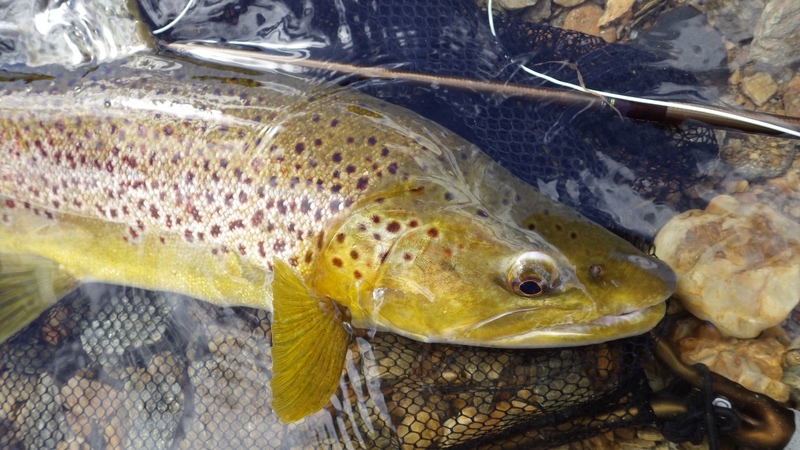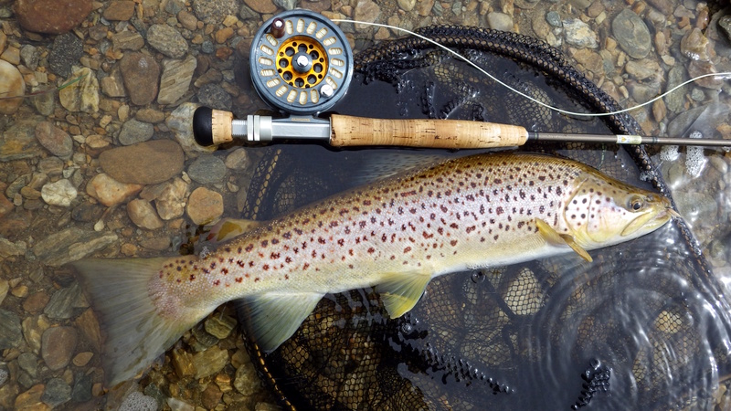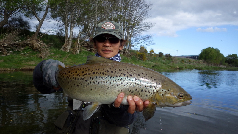 Fly Fishing 2014/10/07 Encountering Unexpected Rises 翌日、月曜日は早朝にまた雨が降ってしまった。 せっかく川の濁りが引きかけているこのタイミングで追加の降雨。 こりゃ終わったな、今週は。 午前中は用事を済ませたりしていたけど、昼過ぎには時間が空いてしまった。 前回の記事に書いた、FISH&GAME NZのオフィスを訪ねた時にオフィサーが教えてくれた、大まかに言うと、Dunedinより南(Gore方面)に向かうとダークな水色の川が多く、逆に北に向かうとクリアーな川が多いという言葉を思い出して気になっていた。 Dunidinから北へ1時間圏内に2本メジャーな川がある。シーズン前にいろいろリサーチした結果、まず釣ってみたい川が南に多かったので昨日はそっち方面にいったけど、北の近場の川も半日釣行向きの川としていつか見に行かなくてはと思っていたので、今日は見るだけでも行ってみるか? ロッド1本だけ用意してSH1を北に向かいます。 手前の1本目の川までわずか40分ほど。近いです。 到着すると予想以上に水色がいい。この川はそれほど濁らなかったようだ。 昨日は見ることができなかった釣れそうな水の色に気持ちも少し上がってきた。 よしやってみるか。 橋のたもとからエントリーしてしばらく川を上がるとブラウンを1匹発見。 けっこういいサイズ。50cmはゆうに超えている。 ただスローな水深のある流れで泳ぎ回ってしまっているのでアプローチしにくい。 ニンフでしばらく狙ってみたけど、姿を消してしまった。 さらにもう少し釣り上がると、水深は浅くなって大きくゆったりとベンドしているフライ向きの流れに出た。 よし、ここからだな。 すぐに1匹、流れを上っていくブラウンがいた。 しまった!スプークされたか?? 完全にはスプークしてないけど、コイツもけっこう泳ぎ回っている。 この川けっこう魚いるんだな。 と思ったら、そのブラウンがなんと2回もライズした! ゆったりと浮いてきて、カプッと水面で何かを捕食した。 ええっ?何??! さっきDunedinを出てこっちに向かう途中、少しみぞれっぽい雨が降ったりしたんだけど。 今は少し日が射してきたけど、今日は寒いし風がメチャクチャ強い。 この状況でライズなの?? まだシーズン始まったばかりの10月上旬だよ。 北島の川では絶対にありえないこの状況に困惑してしまう。 でも、たしかにライズしたよ。 もう、今はまだ10月だとか、寒いからドライで釣れるわけがないとかそういう固定概念はどうでもいい。今目の前でライズが起こっている事実がすべてじゃないか。 システムチェンジを決意。 チェコニンフなんかやってる場合じゃない。ドライフライだ! 慌てず急ぐんだと自分に言い聞かせ、スプール変えて、ガイドにまたラインを通して... さあ、フライは何を結ぶか? この状況なら、まずは... やっぱりこれでしょう。 アダムスパラシュート#13だ。 NZに来てから、ライズの対象がはっきりしないときや、デカイドライへの反応が良くないとき、シーズン中の盛期以外の時期など、レインボウ、ブラウン問わずにジェネラルに使えて最も信頼できるパターンの1つと自分が考えているフライだ。 次のライズを待って、ヤツの位置を確認してから投入。 無視された。。 3回ほどいいレーンを流したけど全く反応しない。 すると少し下流でまたライズ。 アレ、2匹いるの? どうやら1匹ではないようだ。 フライは無視され続けているけどライズがだんだん頻繁になってきた。 全く予想外の状況に出くわして、何だか頭がおかしくなりそうだ。 久しぶりにマッチ・ザ・ハッチの釣り。 よし落ち着け。フライが合ってないぞ。 我に返って、ライズを観察してみる。 派手なライズではない。下から食い上げてきて、魚の頭がデカイから勢いで口先が水面を破って出るような、そして反転して戻っていくときにテールが出たり出なかったり。 そんな感じのライズ。魚の背中はほとんど出ない。 つまり、水面に乗っかっているものではなく、水面直下を漂うものを捕食しているように見える。 虫は飛んでいない。 サブサーフェイスか? 日本で渓流をやっていたときのように多くのパターンは持っていないけど、サブサーフェイスの対策はしてある。 フローティングニンフ#14にフライを変える。 このパターンは北島でも、ドライフライのシーズン序盤と終盤に時として有効だった。 突風並みの強風が時折吹いてきてキャストが難しいけど、風の合間で何とかキャストしてフライをレーンに送りこむ。 フライチェンジから数投で、すぐに答えは出た。 まずは1発目のブラウンが「バフッ」とエマージャーをくわえた。 ほらやっぱりサブサーフェイスだ! これが狂乱の60分の始まりだった。 ライズを見た感じでは50cmくらいのヤツかと思っていたけど、掛けたらもっとデカかった。 ブラウンにしてはかなり元気のいい、強烈なファイト。 ようやく仕留めた南での初トラウトはやっぱりブラウン。 メジャー忘れたけど軽く60cmは超えてるだろう。5lb。 なんてキレイなブラウンな