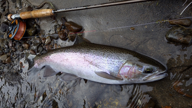 Fly Fishing 2014/09/05 Winter Czech Nymphing on Fire! 勝負の2日目だ。 今日は絶対に釣らなくてはならない。 昨日川を見て回った結果、Tongariroより小さい川のほうがいいと思う。 まずは昨日、魚が見えていた川を朝の3時間ほどやって、その後はもう1本見たい川があるのでそっちをチェックしてみよう。 昨日の川。今日こそは必ず仕留めてやる! と気合を入れてスタートしたものの、朝の時間帯、昨日より見える魚がいない、というか全くいない。 やはりまだ冬の終わりなので、少し暖かくなってからでないと魚が動かないか? でも昨日の午後見た感じだと、あんまりハイライトになってしまうとスプークしやすくて、それもキビシイんだよなあ。。 景色と天気は最高なんだけどなあ。 ムズカシイなあ。。 何にも釣れないまま、2時間くらい釣り上がっただろうか? とあるプールでやっと魚を発見! 直角に曲がるベンドに、増水時に流れ着いた流木や枝がたまっているポイント。 しばらく観察してみる。 オオッ、複数のグッドサイズの魚が固まっているじゃないか!パッと見で10本くらいいるぞ。 ちょっとでも気配を感じると、スプーク気味にこのプールの中をブンブン走り回っているけど、ここから離れる様子はない。 慎重に慎重に近づいて、チェコニンフでアプローチ。 数投で1匹食わせることに成功! でも枝に巻かれてバレてしまった。。。 クゥッソーーー、ようやく掛けた1匹だったのにーーー さらにネバってもう1発! 今度は巻かれないように、強引にダッシュを止めにかかったら、フロロ3Xのティペットを切られた~。 クヤシイィーーー 今回の釣行は1匹への道のりが遠いな... バラすは、根がかりでニンフはどんどんなくなるはで、めげそうになりながらもアプローチし続ける。 そして3度目のフッシュオン!! 今度は大胆、かつ慎重なパワーファイトでようやくランディング成功。 50cm、4lbのナイスレインボウ。 やっと釣ったーー。 久しぶりのいい魚だよ、もう。カッコイイ、オスのレインボウ。 完璧な魚体だ。 これがTaupoのレインボウかあ。Taupo方面でまともなサイズを釣ったのは初めてなのでうれしい。 よしよし、もう一発狙っていく。 そして、再びフィッシュオン! 今度はさっきよりデカイ!! すぐ後ろにはブッシュが控えているので、ロッドを立てて、上へ上へと強引にリフト。 あ、これはマジでデカイ。 マイLOOPロッド折れそう。。 がんばってくれーー ランディングしたーー 今度は5lb、57cm。またまた完璧な魚体のオスだ。 クーーッ、やっちゃった。これぞ求めていた魚だ。 この後もう1発掛けましたが、再びティペットを切られてドロップ。 結局この1スポットで5本食わせて、2キャッチ、3ロスト。 デカイ魚が固まっていた、今の状況では奇跡的なスポットだった。 昼過ぎにこの川を上がって、次の川に向かいます。 ここも初めての川。エントリーポイントから2.75km上流までは冬でもOKだ。 メッチャいい川じゃないか! さっきの川より水量があって、水色もほどほどに色が着いていて釣り易そう。 ただバンクのブッシュはOver Grown気味でブラックベリーが多く、水深もあるので歩きにくそうな川だ。 初めてすぐにブラインドのチェコニンフで1発! キレイなメスのレインボウ。 43cmくらいだけど、太くていい魚だ。 次は45cmのオス。 とりあえず 1kmくらい釣り上がってみて、もう2発。 両方とも45cmくらいの太いメスをブラインドで。 いや~、いい天気だなあ。 そういえば、New Zealandのマオリ語の国名、”Aotearoa”は「細く長い雲(がたなびく地)」という意味なのだ。 今日の青空に薄く長く広がる雲はそんな感じだ。 こっちの川でも4本釣ったからいいだろう。 明日はもう少し上流まで上がってみよう。 今日はトータルで6本釣ったので、夕方はTongariroに賭けてみる。 他のローカルアングラーはほぼ例外なく、ご当地メソッドのデカイインジケーターにヘビーニンフの釣り。 自分はこの方法ではなく、スペイロッドにウエットフライのノースアメリカンスタイルでスチールヘッドっぽく釣ってみたいのだ。 今回の釣行のメインテーマは「スペイでTongariroを釣る」ですから。 昨日のつり橋したのプールに入って、1時間半のイブニング勝負。 いつもレイクでも使っている、パートリッジをフロントに使ってウエットっぽく巻いた黒のウーリーバッガーを流す。 何のアタリもないまま6時を回ってあきらめかけた頃、流し終わりのターンでバイトがっ! あ~、ショートバイトで乗らなかった。 集中して同じレーンをもう3回ほど流すとガツーンと乗った!! 久々にSAGE ONE 7126でリールファイト! そんなにデカくはないけど、とりあえず3lb、50cmのレインボウ。 ついにTongariroのレインボウをスペイで釣ることができたーー! もう暗くなってしまった。 よしよし、テーマも達成したし、7本釣って大満足の2日目終了。