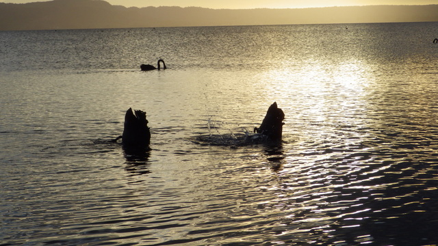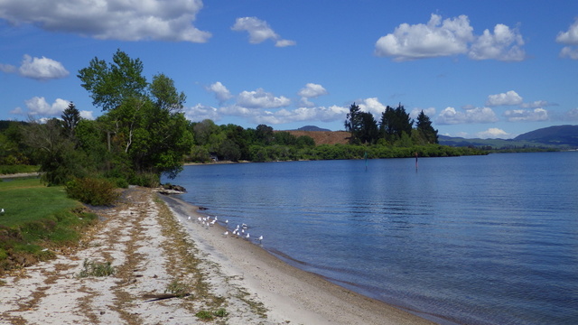Fly Fishing 2013/10/14 A Gusty Day 先週のトラウトストリーム解禁釣行はあまりよくなかったので、今週はレイクに逆戻り。 またいつものチャンネル入り口のポイントで、ガツンと衝撃的なバイトが味わいたい。 ただ天気予報ではけっこう風が吹くようなで、それが気がかり。 ちょっと遅めの9時過ぎに現地到着するものの、 うわ~、こりゃダメだ~~ 予報では西風ってことだったので何とかなるかなと考えていたが、実際には強い南西風。 白波ジャバジャバで、すでにこのエリアは激濁り... とりあえず20分ほどやってみますが、すぐあきらめた。 さあ、どうするか? 南西風だから、西岸と南岸のポイントが風裏になる。 隣のLake Rotoitiの南岸が近いけど、この前もそのパターンだったから、今日はLake Taraweraの西岸にしよう。 Lake Tarawera、すごく綺麗なレイクです。 超クリアなブルーの水。正面の横に広い山がMt.Taraweraです。 2ヶ所ほどやってみますが、バイトなし。魚の気配なし。 なんだか眠くなってきたので、11時だけど早くも昼寝 zzz...(ビールなしで)。 1時間半くらい寝た。Lake Rotoruaにもどって、西岸のストリームマウスのポイントへ。 春になったことだし、シャローを徘徊しているブラウンがいるかもしれない。 ↓ いませんでした(笑)。 チャンネルのポイントに戻ってみよう。 ダメだ~~、今日は風が止まないよ。吹きっぱなしだ~ また鳥たちも全員丘に避難中。 もう行くところもないし、やってみよう。一番やりたいここでやって釣れなければ、納得できるし。 シュートするランニングラインもいつもより短めにして、飛距離よりはこの強風下でもリーダーの先端までターンオーバーさせることを重視。水面激荒れなので、ヘッドはインターミディエイトのボディにT-3のティップで20mくらいのディスタンスをコンスタントにターンオーバーさせて狙っていきます。 2時間くらいはがんばった。でも1発もバイトはなし。 やっぱりこの濁りはキビシイなあ~ 仕方なく西岸のさっきとは別のストリームマウスで最後の時間を過ごしますが、魚の気配はなく終了。 1日目ノーフィッシュ!風景写真集となってしまった。 ん~、1日中吹きっぱなしはマイッタ。春は風の強い日が多いのはNZも日本も一緒ですね。 今夜はホリデーパークで久々の車中泊。明日は風止んでくれるかなあ?