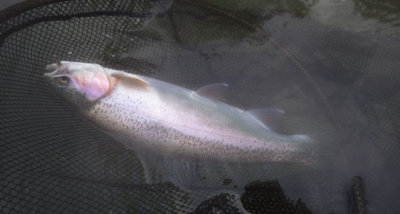 この後、すぐに今日の5発目をキャッチ。ちょっと小さめ、45cmを欠けるくらいのレインボー。撮影前にネットから脱走。