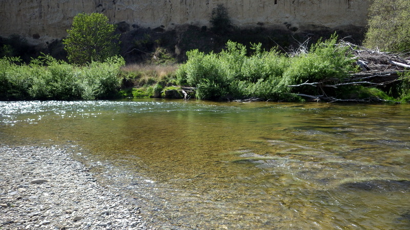 Fly Fishing 2015/10/22 Gale doesn't stop... さあ、明けて月曜日です。 いつもは日曜日にガッツリと丸一日釣って、月曜日はゆっくり昼から半日とかが多いんですが、今週は昨日釣れなかったので、そうゆっくりしてもいられません。 今シーズン初のホームリバー釣行で楽しみだし、頑張って朝から出撃(といっても8時過ぎに出発)です。 昨日ダメだった川で解禁から2週連続でいい釣りをしたものの、最初の週は月曜日の釣行で、先週が日曜日だった。先週は釣れたし、釣り人はいなかったが川遊びやピクニックの人がけっこういたのは気になっていた。だからこの川はやるなら平日かなと思っていたんです。そんなわけで、4WD軍団の登場は想定外だったけど、一方ではああやっぱりという部分もあった。 本来今週は日曜日がホームリバー、月曜日が昨日の川のプランだったのを逆にしたのはホームリバーの水位の問題だったのだ。 英語では”Median Level”とか”Mean Flow”とかいいますが、この川の標準レベルはこのポイントで11cumecs程度。基本的にこの川でまともな釣りが成立するのはこのMedian Level以下の時だ。 昨シーズン終わり間際の4月の2-3週目に水位がMedian Levelを超えてから、冬の間はずっとこのラインより上だった。それがだんだん下がってきて、10月16日金曜日にようやくこのラインにタッチして、これはいけると思っていたが、夜にまとまった降雨があって、17日土曜日には再びライン上の12-13cumecs付近まで上昇。昨日の川と違って、この川はとても濁りやすいので怪しくなった。 でもとりあえず今シーズン初めて、ホームリバーの川の状態を見たいというのもあって、少しでも水位が下がって濁りも引くように、あえて順番を入れ替えて釣行しました。 Central Otagoの景色を満喫できる、大好きなホームリバーに向かうルート。 夏場は枯れた荒涼とした景色になるけど、春はグリーンがあってまたキレイです。 しかし前年ながら昨日からの強風がまだ止まない。 運転中もビュービューとかなり風が強そうな音が続いている。 ホームリバーに着いた。 ああ~、やっぱり濁ってるし、水が多いなあ。。 もともとタンニンカラーの水色のこの川だから、どうしようもないほどの濁りではないけど、良くはないといった感じ。 水色より問題なのは水量とこの強風ですね。 とりあえず準備して、少し川を歩いてみたがすぐに止めた。 よし、プランBに移行しよう。 今日のプランBとはこの川の支流を釣ること。 もう30kmほど上流の支流に向かう。 ホームリバーの重要なスポーニングストリームの一つといわれているこの支流。 夏季はものすごく水が少なくなってしまう小さな川で、この川を釣るならまだ水量があって、冬に産卵に上がった魚が本流にドリフトバックしてしまう前のシーズン初めの2ヶ月と、シーズン最後の4月に次の産卵で魚が川に上がり始める頃。つまり今月、来月はチャンスということ。 4月に一度見に来たことがあるが、水が少なくて魚は全くいなかった。だからまだここで魚を釣ったことはない。 先週まではもっと水があったようだったが、すでにかなり減ってきている。それでも4月に見た時よりはまだ全然ましだ。 さあ、どうかな~? まずエントリーポイントから1kmほどダウンストリームに歩いて、そこからスタート。 水深のあるプールは少ないけど、所々にブラインドでもしかしたらという感じのスポットがある程度。 サイトで見える魚いないなあ。。 相変わらす風が強くて、いい加減イヤになってくる。 ダメかなあ?魚いないし。。 ほとんどあきらめ気味で、もう少しでエントリーポイントまで戻るちょっと手前で、ようやく1匹発見した! 流れを遮る形で横たわっている倒木の裏にある、ちょっとしたポケットウォーター。 この画像でもほぼ中心にはっきりと見えますね。 コレはもう少し引いて撮った画像。 実は下から釣り上がってきて、魚を見つける前に中州からブラインドでポケットに数投アプローチして、反応がないので画像下のグリーンの高台に渡った時に横目で魚を発見した。 何だ、やっぱりいたんじゃないか。 けっこう深くて、魚はボトムにベッタリだな。 なかなかいいサイズで、推定60cmくらいのやつか? ドロッパーが短すぎて、ニンフが魚の視界に入らなかった可能性もある。 今日はそんなにチャンスは多くなさそうだから、こいつは絶対に仕留めたいところだ。 慌てずに、まずは70cm程度だったドライ&ニンフのドロッパーの長さを1.2mくらいに長く。そしてリードワイヤーでウエイテッドの軽めのニンフから2.3mmのタングステンビーズ#12フェザントテイルニンフに変更。 タイミングを見計らって、グリーンの高台からリーダーキャストでフライを投入。 フライは上流を向いている魚の左横に落ちた。 う~ん、ちょっとどうかな~? って位置で、もう一度投げ直すか迷ったが、倒木の裏は流れが止まっているのでしばらく放置してみる。 すると、急にブラウンが左回りに反転してスーッとニンフに向かっ