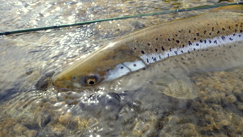 Fly Fishing 2015/10/16 Spotting the Brown さあ、解禁から2週目の日曜日です。 先週の好釣果から、行き先はもう先週と同じ川しかないでしょう。 今回は、先週やりきれなかった範囲をもう少し広く見て回りたい。 もともと、春先のこの時期にしては水が低めだからこそ選んだこの川なんですが、先週の釣行から少しずつではあるがずっと水位は下がり続けて、到着してみると う~ん、ちょっと減りすぎたな~といった感じ。 先週ファーストフィッシュが出たスポットも不発で、とりあえず釣りあがる。 途中、1匹ブラウンを見つけてアプローチするものの、フライを嫌って逃げていってしまう。 そしてこのスポットでこの日2匹目を発見した。 よし、まずフライを変えよう。 ドライ&ニンフのドライを#10スティミュレイターから#12アダムスパラシュートに。 ニンフも#12スティックカディスから#14フェザントテイルへと小さく。 背中が黒っぽく見えるけっこういいサイズ。先週の最後の魚、6.5lbと同じくらいだろう。 2投目でピッタリのレーンにフライを送り込むと、ブラウンがそっちにスッと寄って行って、前のめりに一瞬動いた。口を空けたようには見えなかったけど食ったのか!? きき気味にロッドをリフトしてみるとズシンと重さが乗った。 やっぱり食ったんだっ!! デカイっ!! ところがフライラインがリールフットの回りに絡み付いていた。 手で外すのに手間取って、ドラグが滑りだすのが一瞬遅れてしまい、 プンッっと身切れしたような感触が伝わってきて、痛恨のフックアウト~ あ~~、しまった~~、やってしまった~ いい魚だったのになあ。。 この後、同じスポットの少し下手でもう1匹を半サイトで掛けた。 魚のサイズははっきり見ていないけど、かなりのグッドファイターで小さくはなかったはず。 今度はリールファイトで問題なくやりとりしていたのに、対岸に向かって走られた時にプレッシャーをかけて寄せに転じると、またしても身切れの感触でバラシ。。 うわ~~、なんで~~ まあ、コレは仕方がないですね。ミスしたわけではないので。。 皮を薄く縫うようにフッキングしたんでしょうね。 2匹バラシてガックリしながら、釣り上がったときとは反対側のバンクを歩いてエントリーポイントに戻る。 途中、ふと目をやったバンク際で黄色い背中のいいブラウンを発見。 向こうも完全にこちらの存在に気付いて、ゆっくりバンク際を離れて沖のほうへ泳いでいく。 ただスプークしてバァーっと走っていってしまったわけではなく、ホントは日当たりのいいバンク際に居たかったんだけど、人の気配がしたから仕方なくスーッと沖に向かって動いたような感じだった。 もしかしたらまだチャンスがあるかもしれない。 ゆっくり静かに水の中に入って、徐々に岸から離れていくブラウンを目で追う。 すでにブラウンは川の真ん中を越えた辺りまで到達している。 よし1発勝負だ。 後ろのバンクには木がたくさんあるのでフォルスキャストすると引っかかる恐れがある。 普通のWFのラインだけど、水面にペリーポークでラインを畳んで、無理やりスカジットで投げた! 正直、届かないと思っていた。 ところがループは意外と伸びて、対岸に向けて泳いで離れていくブラウンを1m弱くらい超えた辺りにフライは落ちた。 そしてドライがズボッと消えた。 食ったーー!! なんと見事な1撃!自分でもビックリ!! コイツもデカイっ!! 初めは手前に向かって走ったけど、こっちの姿を見ると今度は対岸に向かって暴走。対岸のバンク際のブッシュの下に張り付くようにゆっくり上に行ったり、下に行ったり。 さっきの2回の身切れバラシが頭をよぎって怖いけど、こっちからもプレッシャーを掛けていかないと、いつまで経っても勝負が着かない。 ファイト中盤くらいで今度はフッキングがいいことを信じて、グイグイ寄せにかかる。 それでも10分以上かかったかもしれない。 ようやく無事にこの日の1匹目をランディング。 やった~、今日も仕留めることができた。 デカイし。。 6.5lb、66cm。 この川ホントにこんなのばっかりだ。恐るべし! さらに車に戻る途中、行きに攻めたけど不発だったポイントで薄っすら1匹見えているのを発見。 たぶん朝のうちはブッシュの下に入ってしまっていて、昼近くになって手前にフィーディングで出てきたんでしょう。 やっぱりいるんだなあ。 コイツも1発で食わせた! すごいキレイなジャックだ。 コレは大したサイズじゃないかと思っていたけど、ランディングしてみるとコレでも6lb、61cmある。 完璧な魚体だ。 そんなに太くはないけど、スキニーなわけでもないキレイなシェイプ。すべてのヒレも完璧だし、朱点はないけど色もいい。コレこそブラウントラウトといったモデルのような魚といっていいだろう。 自分が今まで釣ったブラウンの中でも、最もきれいな部類に入る1匹。 サイコーです。 よしよし、コレで2バラシの後2キャッチで、自分のペースは取り戻した。 ランチ休憩の後、午後の部は先週同様にも