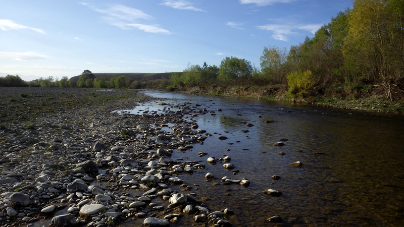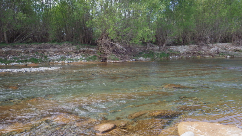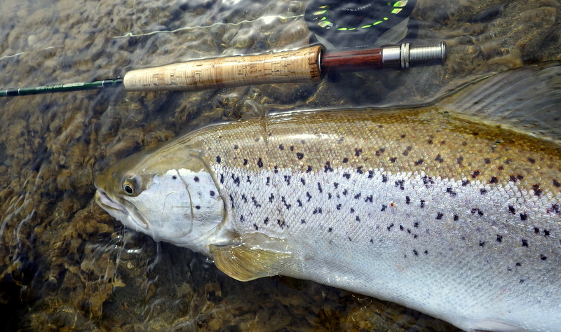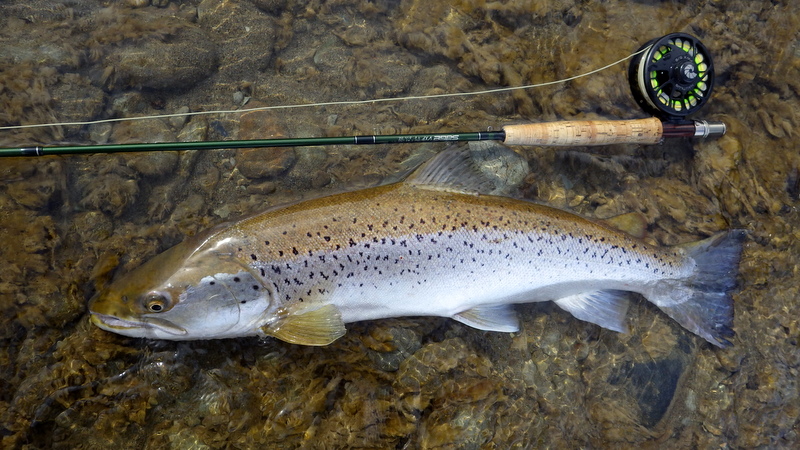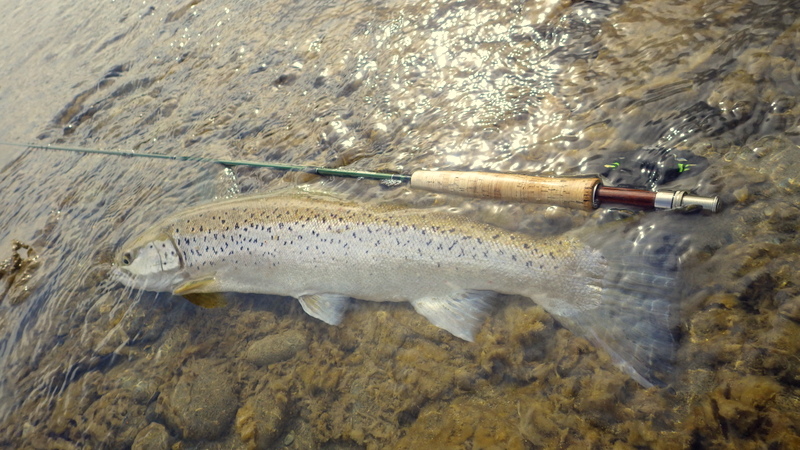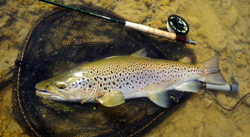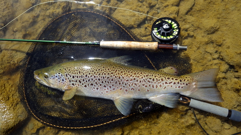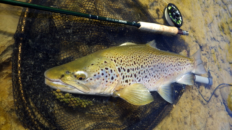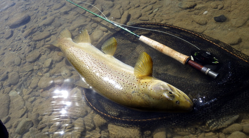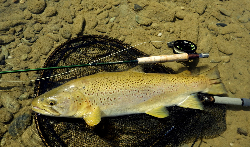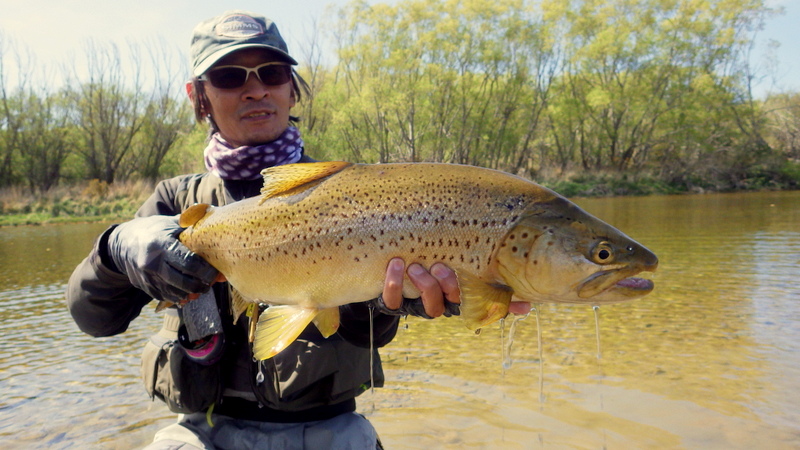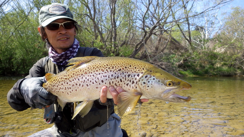 Fly Fishing 2015/10/16 Spotting the Brown さあ、解禁から2週目の日曜日です。 先週の好釣果から、行き先はもう先週と同じ川しかないでしょう。 今回は、先週やりきれなかった範囲をもう少し広く見て回りたい。 もともと、春先のこの時期にしては水が低めだからこそ選んだこの川なんですが、先週の釣行から少しずつではあるがずっと水位は下がり続けて、到着してみると う~ん、ちょっと減りすぎたな~といった感じ。 先週ファーストフィッシュが出たスポットも不発で、とりあえず釣りあがる。 途中、1匹ブラウンを見つけてアプローチするものの、フライを嫌って逃げていってしまう。 そしてこのスポットでこの日2匹目を発見した。 よし、まずフライを変えよう。 ドライ&ニンフのドライを#10スティミュレイターから#12アダムスパラシュートに。 ニンフも#12スティックカディスから#14フェザントテイルへと小さく。 背中が黒っぽく見えるけっこういいサイズ。先週の最後の魚、6.5lbと同じくらいだろう。 2投目でピッタリのレーンにフライを送り込むと、ブラウンがそっちにスッと寄って行って、前のめりに一瞬動いた。口を空けたようには見えなかったけど食ったのか!? きき気味にロッドをリフトしてみるとズシンと重さが乗った。 やっぱり食ったんだっ!! デカイっ!! ところがフライラインがリールフットの回りに絡み付いていた。 手で外すのに手間取って、ドラグが滑りだすのが一瞬遅れてしまい、 プンッっと身切れしたような感触が伝わってきて、痛恨のフックアウト~ あ~~、しまった~~、やってしまった~ いい魚だったのになあ。。 この後、同じスポットの少し下手でもう1匹を半サイトで掛けた。 魚のサイズははっきり見ていないけど、かなりのグッドファイターで小さくはなかったはず。 今度はリールファイトで問題なくやりとりしていたのに、対岸に向かって走られた時にプレッシャーをかけて寄せに転じると、またしても身切れの感触でバラシ。。 うわ~~、なんで~~ まあ、コレは仕方がないですね。ミスしたわけではないので。。 皮を薄く縫うようにフッキングしたんでしょうね。 2匹バラシてガックリしながら、釣り上がったときとは反対側のバンクを歩いてエントリーポイントに戻る。 途中、ふと目をやったバンク際で黄色い背中のいいブラウンを発見。 向こうも完全にこちらの存在に気付いて、ゆっくりバンク際を離れて沖のほうへ泳いでいく。 ただスプークしてバァーっと走っていってしまったわけではなく、ホントは日当たりのいいバンク際に居たかったんだけど、人の気配がしたから仕方なくスーッと沖に向かって動いたような感じだった。 もしかしたらまだチャンスがあるかもしれない。 ゆっくり静かに水の中に入って、徐々に岸から離れていくブラウンを目で追う。 すでにブラウンは川の真ん中を越えた辺りまで到達している。 よし1発勝負だ。 後ろのバンクには木がたくさんあるのでフォルスキャストすると引っかかる恐れがある。 普通のWFのラインだけど、水面にペリーポークでラインを畳んで、無理やりスカジットで投げた! 正直、届かないと思っていた。 ところがループは意外と伸びて、対岸に向けて泳いで離れていくブラウンを1m弱くらい超えた辺りにフライは落ちた。 そしてドライがズボッと消えた。 食ったーー!! なんと見事な1撃!自分でもビックリ!! コイツもデカイっ!! 初めは手前に向かって走ったけど、こっちの姿を見ると今度は対岸に向かって暴走。対岸のバンク際のブッシュの下に張り付くようにゆっくり上に行ったり、下に行ったり。 さっきの2回の身切れバラシが頭をよぎって怖いけど、こっちからもプレッシャーを掛けていかないと、いつまで経っても勝負が着かない。 ファイト中盤くらいで今度はフッキングがいいことを信じて、グイグイ寄せにかかる。 それでも10分以上かかったかもしれない。 ようやく無事にこの日の1匹目をランディング。 やった~、今日も仕留めることができた。 デカイし。。 6.5lb、66cm。 この川ホントにこんなのばっかりだ。恐るべし! さらに車に戻る途中、行きに攻めたけど不発だったポイントで薄っすら1匹見えているのを発見。 たぶん朝のうちはブッシュの下に入ってしまっていて、昼近くになって手前にフィーディングで出てきたんでしょう。 やっぱりいるんだなあ。 コイツも1発で食わせた! すごいキレイなジャックだ。 コレは大したサイズじゃないかと思っていたけど、ランディングしてみるとコレでも6lb、61cmある。 完璧な魚体だ。 そんなに太くはないけど、スキニーなわけでもないキレイなシェイプ。すべてのヒレも完璧だし、朱点はないけど色もいい。コレこそブラウントラウトといったモデルのような魚といっていいだろう。 自分が今まで釣ったブラウンの中でも、最もきれいな部類に入る1匹。 サイコーです。 よしよし、コレで2バラシの後2キャッチで、自分のペースは取り戻した。 ランチ休憩の後、午後の部は先週同様にも