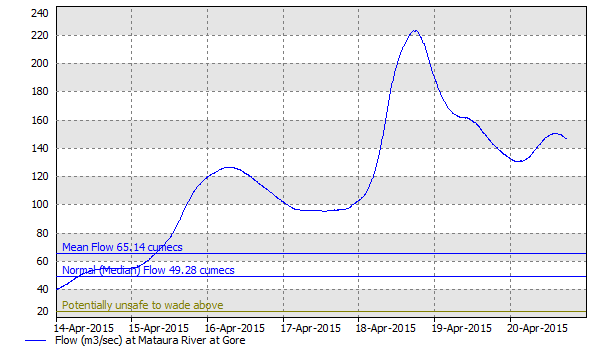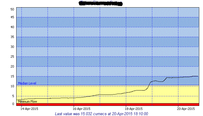 River flow at my home river. It was lower than 5 cumecs on last Monday and the water was quite good. And then, on 18Apr, Saturday, the river flow started to rise up dramatically and got above median level and reached about 15 cumecs.