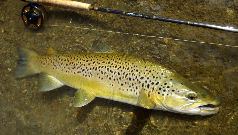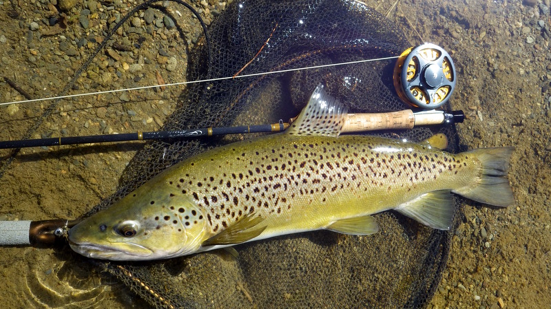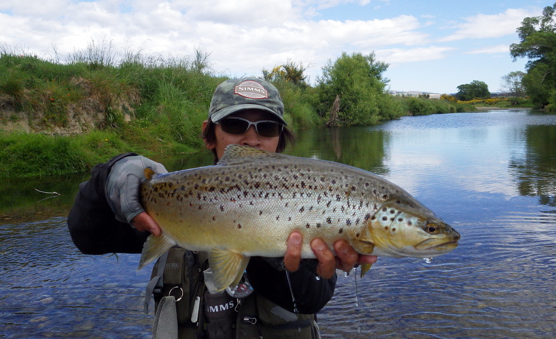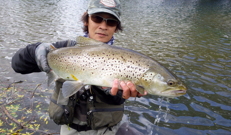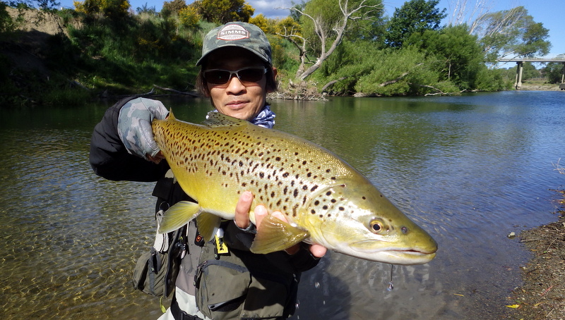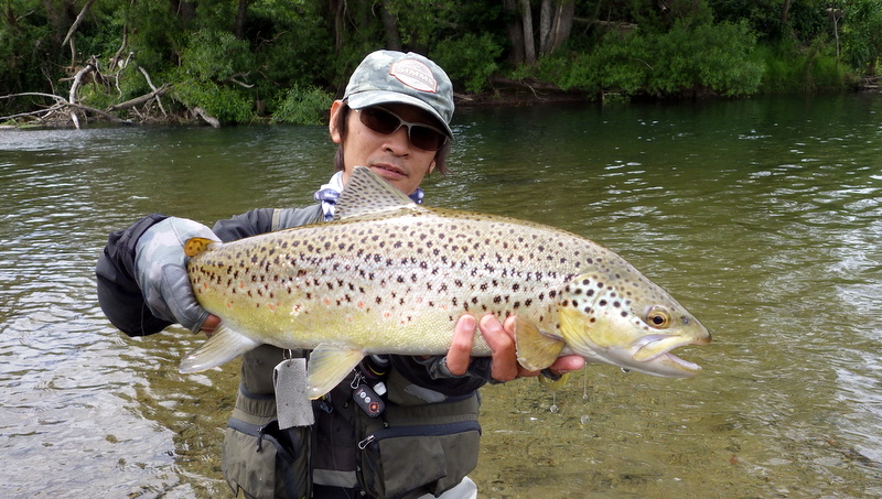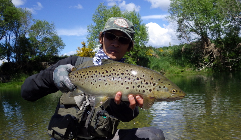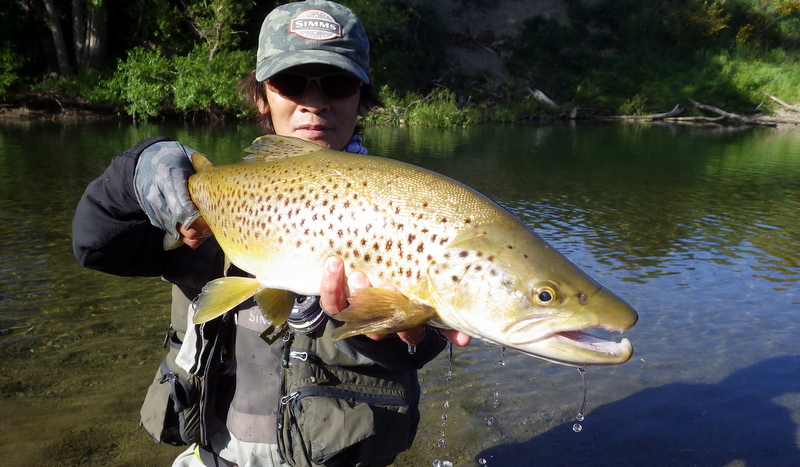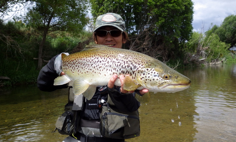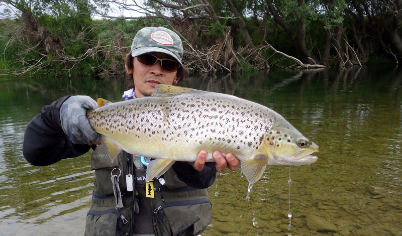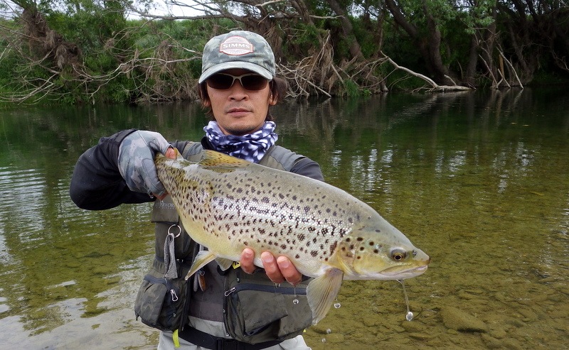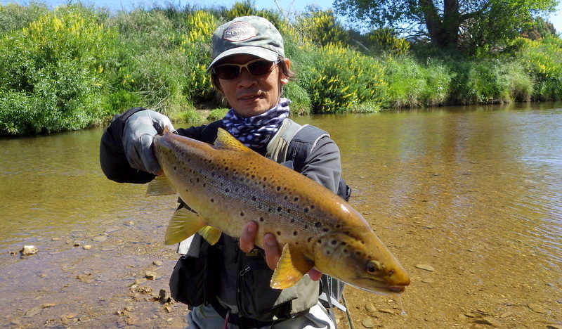 Fly Fishing 2014/11/17 Successful Weekend with Some Bad Luck 先週は久しぶりにいい魚も捕れたし、例のターゲット、「アイツ」の存在も気になるので、また同じ川へ。 まず先週の釣行で、数匹のブラウンがいたエントリーポイントからすぐのポイントを観察。デカイのがランディング寸前で肉切れでフックアウトしてしまった場所です。 おっ、今日も1匹いるな。 先週デカイのが2匹居て、1匹バラシてもう1匹はバイトしなかった。 たぶんあのもう1匹のヤツだな。 手前の浅瀬に乗っかってエサを探している様子。 これはチャンスだ! 今日もドライ&ニンフをセットアップして、慎重に近づいてアプローチします。 2投で仕留めました! してやったり。いきなり朝一からビッグブラウンを捕獲。 6lb、65cmのナイスワン。 コイツはシーランぽい色だな。先週バラシた方はもっと黄色いヤツだった。 この後、先週6.5lbをキャッチしたポイントにも50cmクラスのが2~3本いたものの、フライを見切られ、次はアイツの棲家のポイントへ。 またいるいる。 でも今日は1匹じゃない。もう2~3匹いるじゃないか。 魚が増えたようだ。 アイツの他に、ほとんど同じくらいのがもう1匹と、一回り小さいのが2匹いるようだ。 一回り小さいといっても65cmくらいはあるだろう。 やはりアイツはひと際デカイ。70cmくらいあるんじゃないか? ただ魚の数が増えて、少し動きが変わってしまった。 クルーズしてるけど、パクパクとエサを喰っている状態ではない。 フライを見つけて何回もスーッと寄ってきて、フライと交錯するんだけど、どうしても口を開かない。 けっこう長いこと、たぶん2時間以上狙い続けたけどダメだ。 1匹でいた時のほうが釣れそうだったかな? 今日は無理だ。 車でもう1本下流の橋へ移動。 こっちで魚を探してみよう。 いたいた。このプールに浮き気味のヤツが3~4匹いる。 そのうち1匹はかなりフライが気になり始めたようで、何回も見に寄ってくる。 アイツ釣れそうだな。 自分もこの木に半分隠れて、木の一部となって釣ります。 木化けの術です(笑) ここで、バックキャストで後ろの背の高い草に引っかかったのをちょっと煽ったらなんと。。 ロッドがポキッと折れた... たいして強く煽ったわけじゃないのに、あっさり折れちゃった。。 もうグラファイト繊維の断裂がきてたのかな? LOOP EVOTEC696ですが、ホントに今までよく活躍してくれました。 もう何本のビッグトラウトをランディングしたかわかりません。 いつもこのブログを読んでいただいている方はご存知かと思いますが、一番魚を釣っているロッドです。 南島に来てからも、今シーズンはミニブラウンを除いてすべてこのロッドだし。 6番ロッドはこれしか持っていません。相当釣り込んだので、昨シーズンからそろそろ6番のバックアップのロッドが必要だなあと思っていたけど、やっぱり。。ついにいってしまった。 何か6番のバックアップを用意して修理に出そう。 まだまだ使いたい大好きなロッドだし、ホントに数々のドラマをサポートしてくれて感謝している。 一旦、ロッドを交換しに車に戻って、ゲーム再開。 そして狙い通り、さっきからフライに絡んできていたヤツがついに食った! またまたデカイブラウン。 この日2本目の6lb、62cmのジャック。 頑張って5番のG2でランディングしたけど、このブラウンは強烈な引きだったのできついなあ。 対岸のブッシュの下に突っ込まれる寸前で、やばかった。 そして同じスポットからもう1発! またしてもいいブラウン。 5lbちょい、61cm。 美しいブラウンです。 なんかこの川のブラウン、デカイのばっかりだ。 この日3本のビッグブラウンをすべてドライ&ニンフのサイトフッシングでキャッチ。 もう大、大満足の1日。 翌日も半日ほど同じ川を釣った。 今週はもう徹底的にサイトフィッシングでやってみよう。 この日は前日以上にフライを見切られる。 天気も終日雲りがちで、活性が上がりきらないか? まあ、食い気のあるヤツは昨日自分で釣ってしまったから仕方ないな。 この岸よりのウィードベッド沿いにクルーズしているすんごいのがいる。 うっわ、でっけえぇなあ~~アイッツ!! あの例のずっと狙い続けているアイツよりデカイ。70cm超え、オーバー10lbじゃないか?濃いグリーンの背に体側がオレンジっぽい凄い色してる。釣って写真撮りたいなあ。。 ここは足場が悪いし、仮に掛けてもちょっと捕れそうもないけど。どんだけスゴイパワーだろう? 警戒心も並じゃないです。。 また別の機会に来てみよう。 結局2日目は全部で5~6回チャンスがありましたが、フッキングして直後に外れてしまったのが1回(デカかった)と、後はスッポヌケと一瞬ですぐにニンフを離されてしまってアワセるチャンスなし。 サイトで同じ川を2日連続でやるのは、あまりいいアイディアではなかったな。。 今日はノーフィッシュで終了かとあきらめかけた最後の最後。 エントリーポイントのすぐ近くの岸よりに、エサを探してウロウロしているヤツを1匹発見