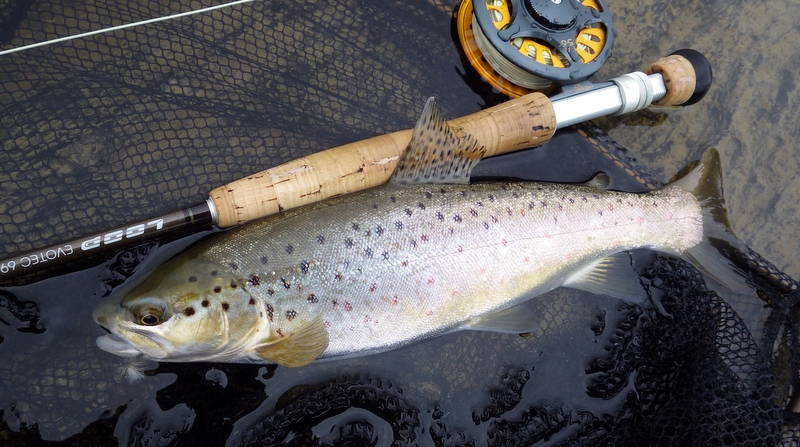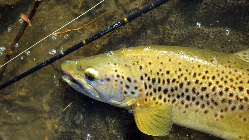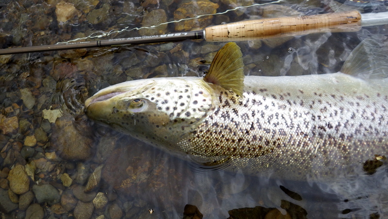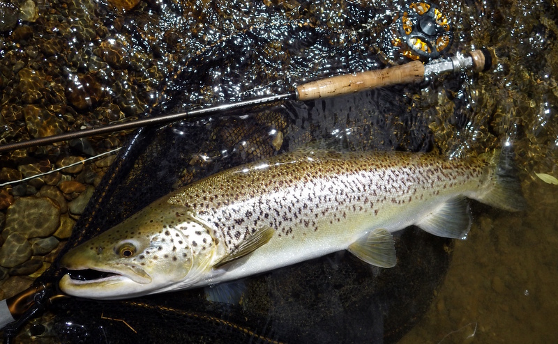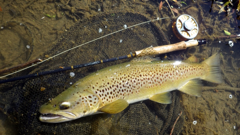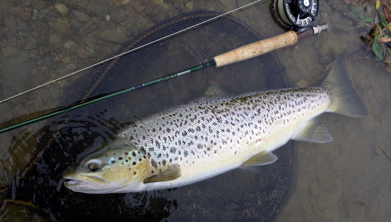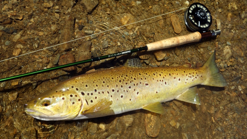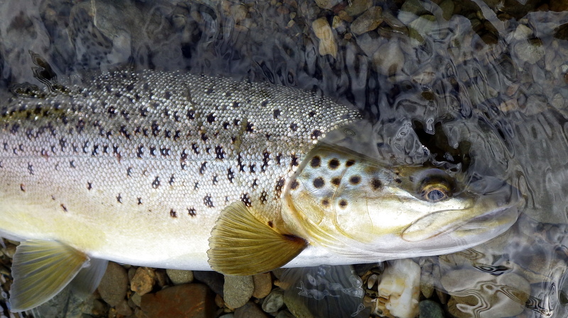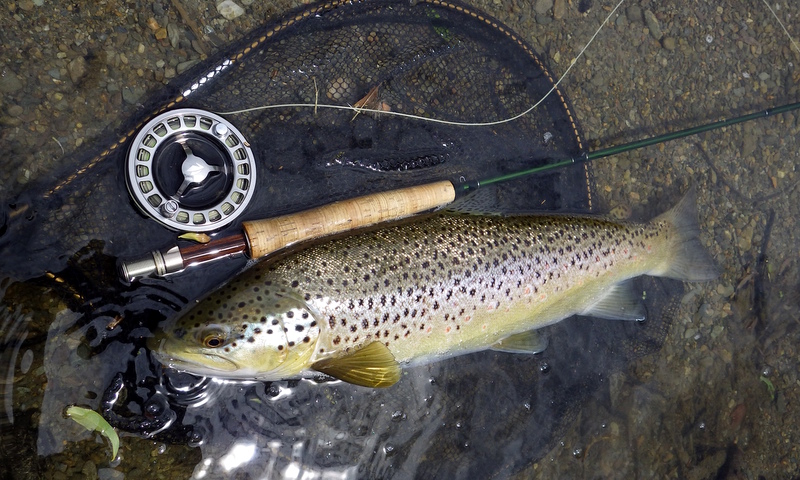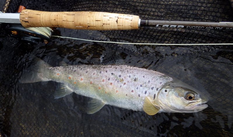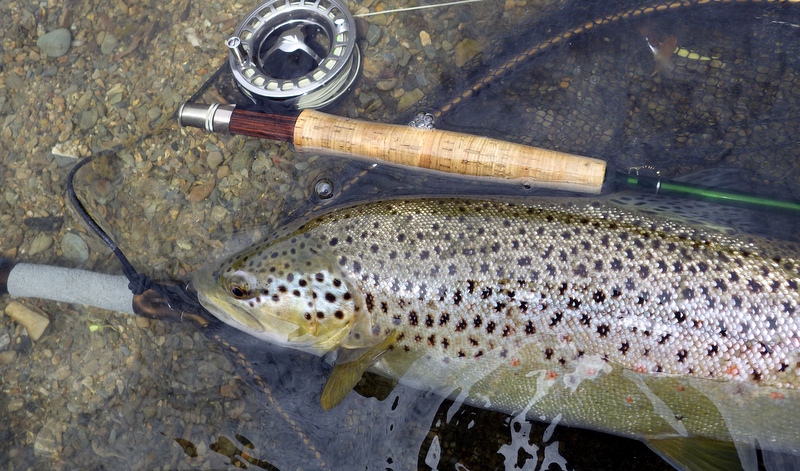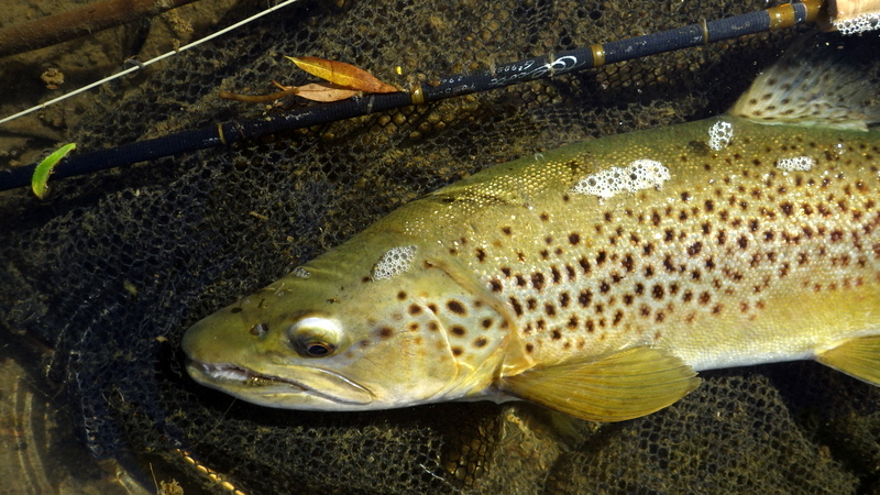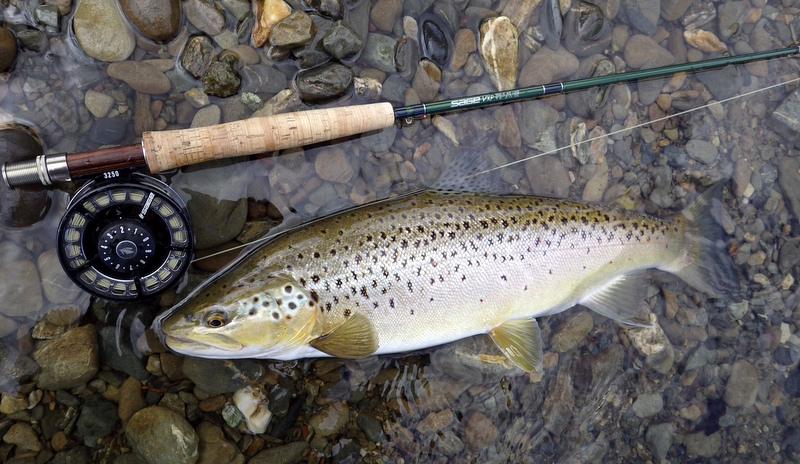 Fly Fishing 2014/11/17 Successful Weekend with Some Bad Luck 先週は久しぶりにいい魚も捕れたし、例のターゲット、「アイツ」の存在も気になるので、また同じ川へ。 まず先週の釣行で、数匹のブラウンがいたエントリーポイントからすぐのポイントを観察。デカイのがランディング寸前で肉切れでフックアウトしてしまった場所です。 おっ、今日も1匹いるな。 先週デカイのが2匹居て、1匹バラシてもう1匹はバイトしなかった。 たぶんあのもう1匹のヤツだな。 手前の浅瀬に乗っかってエサを探している様子。 これはチャンスだ! 今日もドライ&ニンフをセットアップして、慎重に近づいてアプローチします。 2投で仕留めました! してやったり。いきなり朝一からビッグブラウンを捕獲。 6lb、65cmのナイスワン。 コイツはシーランぽい色だな。先週バラシた方はもっと黄色いヤツだった。 この後、先週6.5lbをキャッチしたポイントにも50cmクラスのが2~3本いたものの、フライを見切られ、次はアイツの棲家のポイントへ。 またいるいる。 でも今日は1匹じゃない。もう2~3匹いるじゃないか。 魚が増えたようだ。 アイツの他に、ほとんど同じくらいのがもう1匹と、一回り小さいのが2匹いるようだ。 一回り小さいといっても65cmくらいはあるだろう。 やはりアイツはひと際デカイ。70cmくらいあるんじゃないか? ただ魚の数が増えて、少し動きが変わってしまった。 クルーズしてるけど、パクパクとエサを喰っている状態ではない。 フライを見つけて何回もスーッと寄ってきて、フライと交錯するんだけど、どうしても口を開かない。 けっこう長いこと、たぶん2時間以上狙い続けたけどダメだ。 1匹でいた時のほうが釣れそうだったかな? 今日は無理だ。 車でもう1本下流の橋へ移動。 こっちで魚を探してみよう。 いたいた。このプールに浮き気味のヤツが3~4匹いる。 そのうち1匹はかなりフライが気になり始めたようで、何回も見に寄ってくる。 アイツ釣れそうだな。 自分もこの木に半分隠れて、木の一部となって釣ります。 木化けの術です(笑) ここで、バックキャストで後ろの背の高い草に引っかかったのをちょっと煽ったらなんと。。 ロッドがポキッと折れた... たいして強く煽ったわけじゃないのに、あっさり折れちゃった。。 もうグラファイト繊維の断裂がきてたのかな? LOOP EVOTEC696ですが、ホントに今までよく活躍してくれました。 もう何本のビッグトラウトをランディングしたかわかりません。 いつもこのブログを読んでいただいている方はご存知かと思いますが、一番魚を釣っているロッドです。 南島に来てからも、今シーズンはミニブラウンを除いてすべてこのロッドだし。 6番ロッドはこれしか持っていません。相当釣り込んだので、昨シーズンからそろそろ6番のバックアップのロッドが必要だなあと思っていたけど、やっぱり。。ついにいってしまった。 何か6番のバックアップを用意して修理に出そう。 まだまだ使いたい大好きなロッドだし、ホントに数々のドラマをサポートしてくれて感謝している。 一旦、ロッドを交換しに車に戻って、ゲーム再開。 そして狙い通り、さっきからフライに絡んできていたヤツがついに食った! またまたデカイブラウン。 この日2本目の6lb、62cmのジャック。 頑張って5番のG2でランディングしたけど、このブラウンは強烈な引きだったのできついなあ。 対岸のブッシュの下に突っ込まれる寸前で、やばかった。 そして同じスポットからもう1発! またしてもいいブラウン。 5lbちょい、61cm。 美しいブラウンです。 なんかこの川のブラウン、デカイのばっかりだ。 この日3本のビッグブラウンをすべてドライ&ニンフのサイトフッシングでキャッチ。 もう大、大満足の1日。 翌日も半日ほど同じ川を釣った。 今週はもう徹底的にサイトフィッシングでやってみよう。 この日は前日以上にフライを見切られる。 天気も終日雲りがちで、活性が上がりきらないか? まあ、食い気のあるヤツは昨日自分で釣ってしまったから仕方ないな。 この岸よりのウィードベッド沿いにクルーズしているすんごいのがいる。 うっわ、でっけえぇなあ~~アイッツ!! あの例のずっと狙い続けているアイツよりデカイ。70cm超え、オーバー10lbじゃないか?濃いグリーンの背に体側がオレンジっぽい凄い色してる。釣って写真撮りたいなあ。。 ここは足場が悪いし、仮に掛けてもちょっと捕れそうもないけど。どんだけスゴイパワーだろう? 警戒心も並じゃないです。。 また別の機会に来てみよう。 結局2日目は全部で5~6回チャンスがありましたが、フッキングして直後に外れてしまったのが1回(デカかった)と、後はスッポヌケと一瞬ですぐにニンフを離されてしまってアワセるチャンスなし。 サイトで同じ川を2日連続でやるのは、あまりいいアイディアではなかったな。。 今日はノーフィッシュで終了かとあきらめかけた最後の最後。 エントリーポイントのすぐ近くの岸よりに、エサを探してウロウロしているヤツを1匹発見