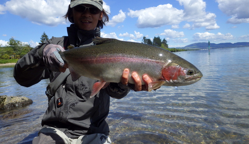 Fly Fishing 2013/10/28 Spring Lake Turnover? 先週末はちょっと用事があって、13ヶ月ぶりにシドニーに行ってきたため釣りなし! 久々にウェーダーを履かない週末でした(笑) 今週末はまたレイクとトラウトストリームの2本立てでフィールドに復帰です。 日曜日、先ずはLake Rotoruaから。 いつものチャンネルのスポットに行きますが、今日も南西の強風と対岸から入ってウェーディングしてる先行者あり。 なんか最近いつもこの風だ。 チャンネルが解禁してから、このポイントもすっかり人が多くなってしまった。チャンネルをやっててくれる分にはいいんだけど、中には前回のマオリのおっさんのように自分と同じ狙いの人や、対岸から立ちこんで同じスポットを狙う人も多い。 2時間近くやって、ショートバイトっぽいのが何回かあっただけで全然ダメ。 別のスポットへ移動。 Hamurana Stream Mouth ここは夏に特にいいといわれている場所で、高水温期にこのストリームの冷たい水を求めて多くのトラウトが集まってくる。 まだ時期的にはちょっと早いけど、ちょっと様子見がてら1時間くらいやってみる。始めてすぐにバイトらしき違和感があったがフッキングせず、その後は続かない。 どうも盛り上がらないので、早くも昼寝。2時間も爆睡してしまった。 このあと何箇所かポイントを回ったがダメで、結局チャンネルのスポットに戻り、夕方になってどうにか釣った唯一の魚がコレ。 まるでイワナのように細い45cmくらいのレインボー。全然引かなかった... このほかにバラシ2本(泣)。ライズはあるのに全然食わない。 また空にツインレインボーが架かった!この場所は雨上がりにいつも虹が出る。 翌朝、再び同じスポットへ。 今朝も南西の風だ。ビュービューではないけど、けっこう強め。 また対岸からウェーディングしてるのがいる。しかも流れに近づきすぎなんだよ。 まあ仕方ない。 開始から40分くらいで1発目のバイト! 50cmくらいか。昨日のよりはマシだけど、コレも細いなあ。なんか今週はおかしいなあ。細い魚ばっかりだ。初めの1時間半くらいは20分に1発くらいのペースでバイトがあった。でも2バラシとショートバイト2回。なんで? その後2時間くらいは全くバイトなし。ここでちょっと気がついた。 なんか 水がトロンとしてて、泡浮いてるなあ。水色も悪い。 これターンオーバー起こってるんじゃない? ターンオーバーっていうと秋のイメージが強いけど、春も表層水が温まってきたところに強い風が吹けば、ターンオーバー起こりますからね。 ただこのLake Rotoruaはシャローフラットなレイクで南端のほうに水深40mくらいのディープホール的な地形があるけど、あとはほとんど水深15m以浅で、巨大な山中湖のようなレイクだ。浅いから比較的ターンオーバーは起こりにくいはずだけど、他のディープエリアでターンした悪い水が風下のこっちに流れてきたのかもしれない。 通常、このスポットは水面が静かなほうがライズが起こりやすく、食いも立つけど今日は風が弱まってもダメだ。ライズはほとんどない。逆に風が吹いてこの粘性の高そうな水が少しでも速く流れたほうがまだマシかも。 そんなことを考えていたら、ちょっと風が強まって、なんとなく食いそうな気がした。すると対岸のアングラーが1本釣った。やっぱりそうか。 どうも前回辺りからショートバイトが多かったり、ライズがあるわりにはあまり食いがよくないように感じていた。解禁とともに人が増えて、アングリングプレッシャー+南西の強風がマイナスのファクターだと思っていたけど、ターンオーバーの影響もありそうだ。 9時過ぎごろから風も強まってきて白波立ってきた~ またかよ~~ よって9時半終了。なんだかさっぱりだったなあ、レイク... 今日はホームリバーのトラウトストリームを半日やるのだ! 昼に目的のストリームに到着 。 前回の今シーズン初釣行から3週間ぶり。今日は中流域をやります。 草のグリーンもだいぶ青々してきて黄色や白、紫の小さな花も咲いて綺麗だなあ。 最近、まとまった雨が降っていないので前回より水量が減った。あまりいい状況ではないけど、とりあえずチェコニンフオンリーで攻めて、 41cmと小さめだけど、今シーズンこの川での初ブラウン。 レインボーは 最大が45cmのオス の他、30~35cmくらいのヤングレインボーが2本遊んでくれました。 前回と比べて、魚の活性は上がってきた模様。でもまだ魚が細いですね。 羊いっぱいいます。 今シーズンもこの川は健在です! あんまりいい魚は出なかったけど、まあまあ楽しめました。あと2週間くらい経ったら、ドライに出てくれないかなあ?