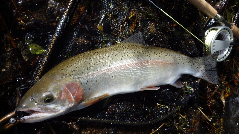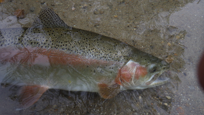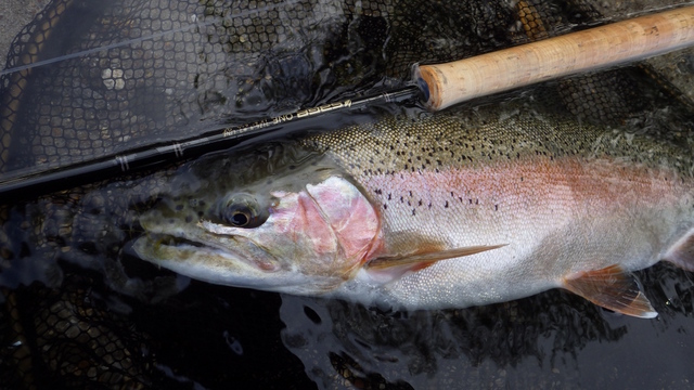 先週まではレインボーオンリーで1日2~3本だけど、このスポットで釣れればサイズはほぼ50cm以上で安定していた。今週末の釣行では久々にブラウンが混じったり、レインボーは42~45cmくらいのが多くなって、サイズにばらつきが出てきたりと状況が変化してきたようだ。でもバイトはかなり増えて、魚の活性は上がってきているように感じる。