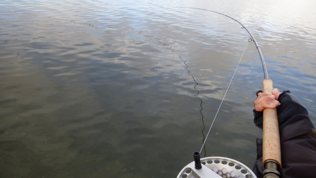 デカイブラウンとのファイトはとにかく持久戦。アクロバティックなレインボーと違ってそんなに走ったり跳ねたりしないけど、とにかく浮いてこない。川だと ブッシュとかに突っ込まれることも考えてファイトする必要があるけど、オープンウォーターのレイクはゆっくりやり取りすればいい。自分の焦りだけが禁物。 早く姿を確認したくて逸るとミスる。