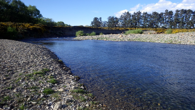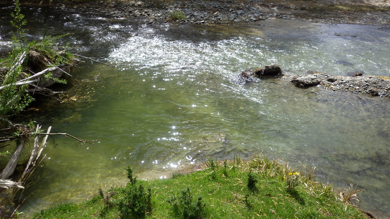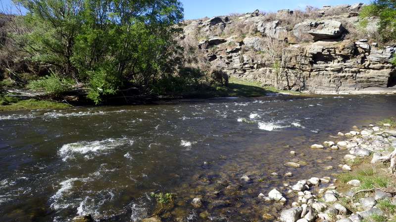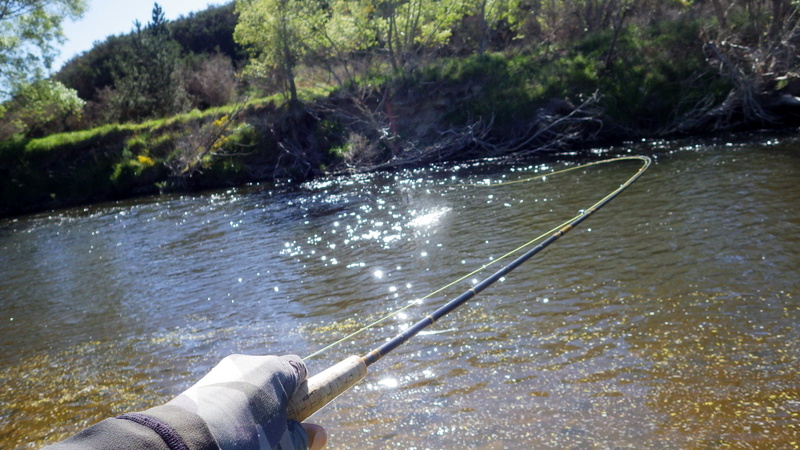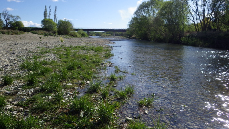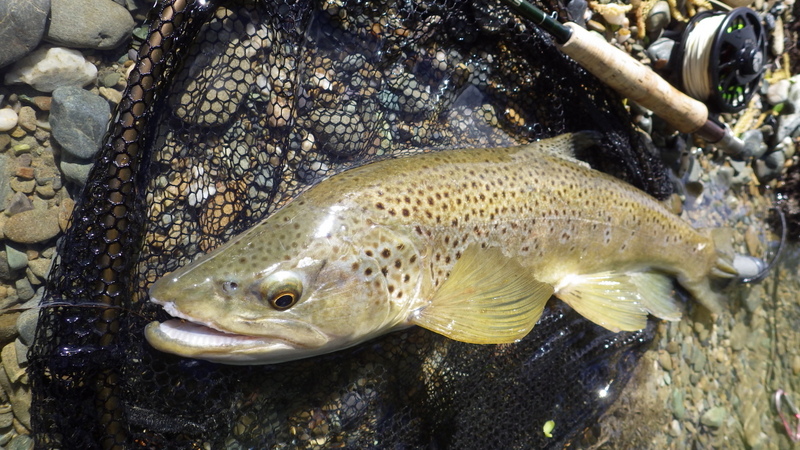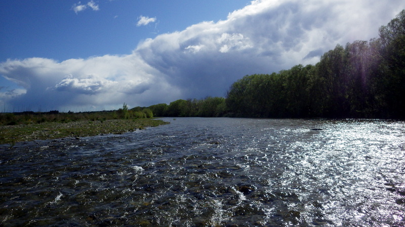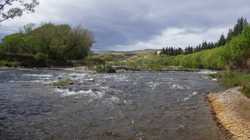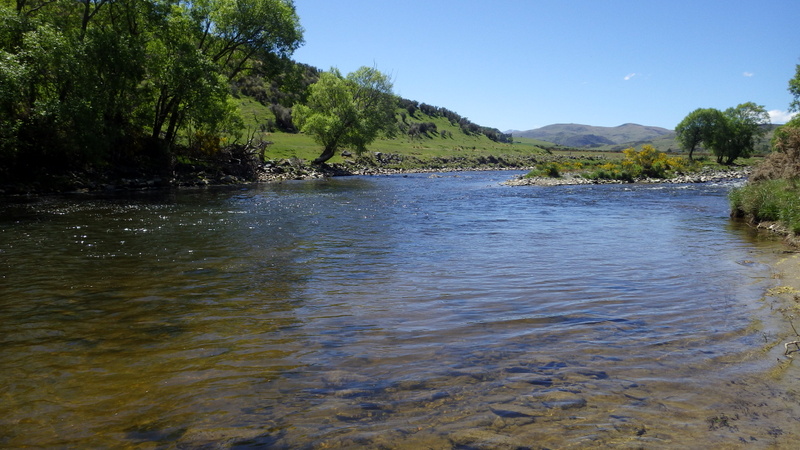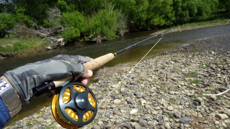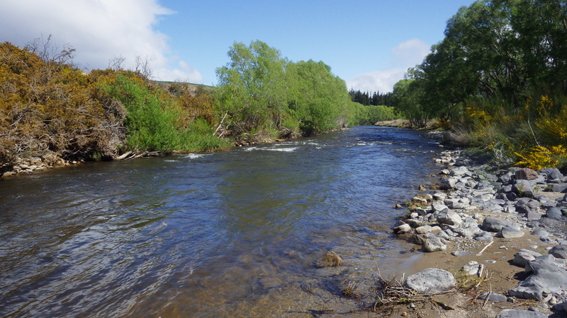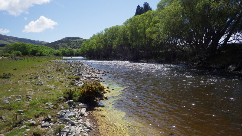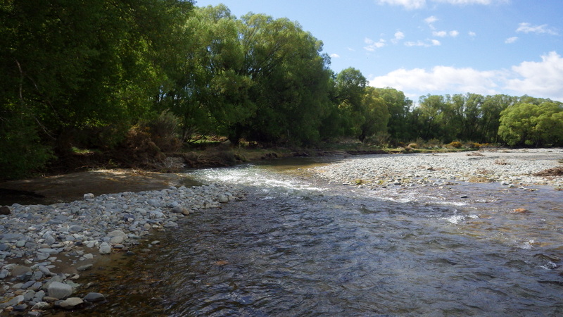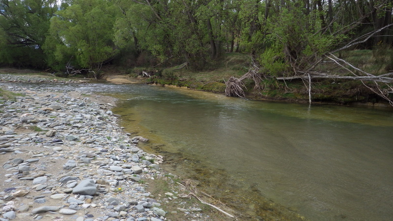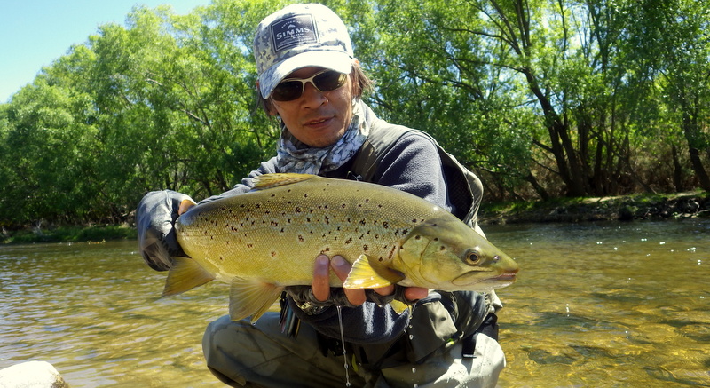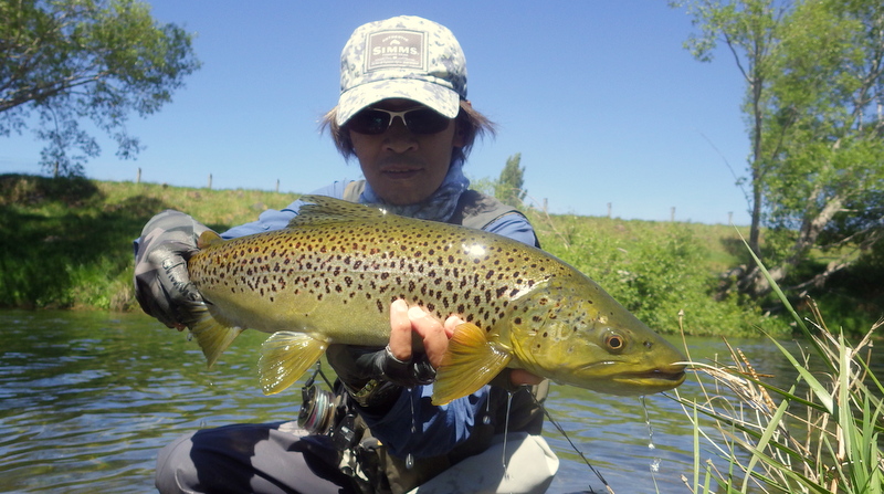 Fly Fishing 2015/10/22 Gale doesn't stop... さあ、明けて月曜日です。 いつもは日曜日にガッツリと丸一日釣って、月曜日はゆっくり昼から半日とかが多いんですが、今週は昨日釣れなかったので、そうゆっくりしてもいられません。 今シーズン初のホームリバー釣行で楽しみだし、頑張って朝から出撃(といっても8時過ぎに出発)です。 昨日ダメだった川で解禁から2週連続でいい釣りをしたものの、最初の週は月曜日の釣行で、先週が日曜日だった。先週は釣れたし、釣り人はいなかったが川遊びやピクニックの人がけっこういたのは気になっていた。だからこの川はやるなら平日かなと思っていたんです。そんなわけで、4WD軍団の登場は想定外だったけど、一方ではああやっぱりという部分もあった。 本来今週は日曜日がホームリバー、月曜日が昨日の川のプランだったのを逆にしたのはホームリバーの水位の問題だったのだ。 英語では”Median Level”とか”Mean Flow”とかいいますが、この川の標準レベルはこのポイントで11cumecs程度。基本的にこの川でまともな釣りが成立するのはこのMedian Level以下の時だ。 昨シーズン終わり間際の4月の2-3週目に水位がMedian Levelを超えてから、冬の間はずっとこのラインより上だった。それがだんだん下がってきて、10月16日金曜日にようやくこのラインにタッチして、これはいけると思っていたが、夜にまとまった降雨があって、17日土曜日には再びライン上の12-13cumecs付近まで上昇。昨日の川と違って、この川はとても濁りやすいので怪しくなった。 でもとりあえず今シーズン初めて、ホームリバーの川の状態を見たいというのもあって、少しでも水位が下がって濁りも引くように、あえて順番を入れ替えて釣行しました。 Central Otagoの景色を満喫できる、大好きなホームリバーに向かうルート。 夏場は枯れた荒涼とした景色になるけど、春はグリーンがあってまたキレイです。 しかし前年ながら昨日からの強風がまだ止まない。 運転中もビュービューとかなり風が強そうな音が続いている。 ホームリバーに着いた。 ああ~、やっぱり濁ってるし、水が多いなあ。。 もともとタンニンカラーの水色のこの川だから、どうしようもないほどの濁りではないけど、良くはないといった感じ。 水色より問題なのは水量とこの強風ですね。 とりあえず準備して、少し川を歩いてみたがすぐに止めた。 よし、プランBに移行しよう。 今日のプランBとはこの川の支流を釣ること。 もう30kmほど上流の支流に向かう。 ホームリバーの重要なスポーニングストリームの一つといわれているこの支流。 夏季はものすごく水が少なくなってしまう小さな川で、この川を釣るならまだ水量があって、冬に産卵に上がった魚が本流にドリフトバックしてしまう前のシーズン初めの2ヶ月と、シーズン最後の4月に次の産卵で魚が川に上がり始める頃。つまり今月、来月はチャンスということ。 4月に一度見に来たことがあるが、水が少なくて魚は全くいなかった。だからまだここで魚を釣ったことはない。 先週まではもっと水があったようだったが、すでにかなり減ってきている。それでも4月に見た時よりはまだ全然ましだ。 さあ、どうかな~? まずエントリーポイントから1kmほどダウンストリームに歩いて、そこからスタート。 水深のあるプールは少ないけど、所々にブラインドでもしかしたらという感じのスポットがある程度。 サイトで見える魚いないなあ。。 相変わらす風が強くて、いい加減イヤになってくる。 ダメかなあ?魚いないし。。 ほとんどあきらめ気味で、もう少しでエントリーポイントまで戻るちょっと手前で、ようやく1匹発見した! 流れを遮る形で横たわっている倒木の裏にある、ちょっとしたポケットウォーター。 この画像でもほぼ中心にはっきりと見えますね。 コレはもう少し引いて撮った画像。 実は下から釣り上がってきて、魚を見つける前に中州からブラインドでポケットに数投アプローチして、反応がないので画像下のグリーンの高台に渡った時に横目で魚を発見した。 何だ、やっぱりいたんじゃないか。 けっこう深くて、魚はボトムにベッタリだな。 なかなかいいサイズで、推定60cmくらいのやつか? ドロッパーが短すぎて、ニンフが魚の視界に入らなかった可能性もある。 今日はそんなにチャンスは多くなさそうだから、こいつは絶対に仕留めたいところだ。 慌てずに、まずは70cm程度だったドライ&ニンフのドロッパーの長さを1.2mくらいに長く。そしてリードワイヤーでウエイテッドの軽めのニンフから2.3mmのタングステンビーズ#12フェザントテイルニンフに変更。 タイミングを見計らって、グリーンの高台からリーダーキャストでフライを投入。 フライは上流を向いている魚の左横に落ちた。 う~ん、ちょっとどうかな~? って位置で、もう一度投げ直すか迷ったが、倒木の裏は流れが止まっているのでしばらく放置してみる。 すると、急にブラウンが左回りに反転してスーッとニンフに向かっ
