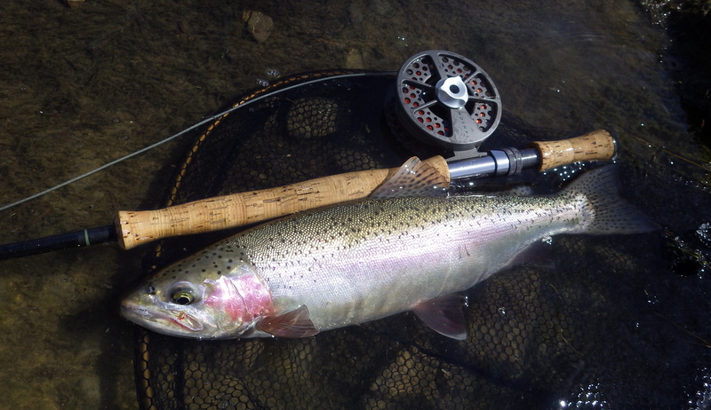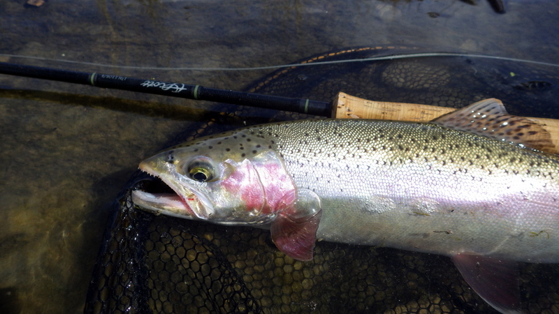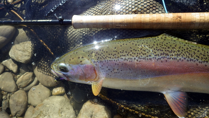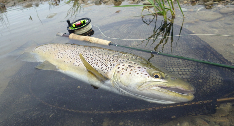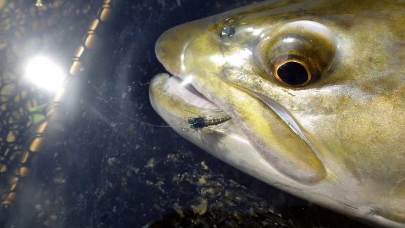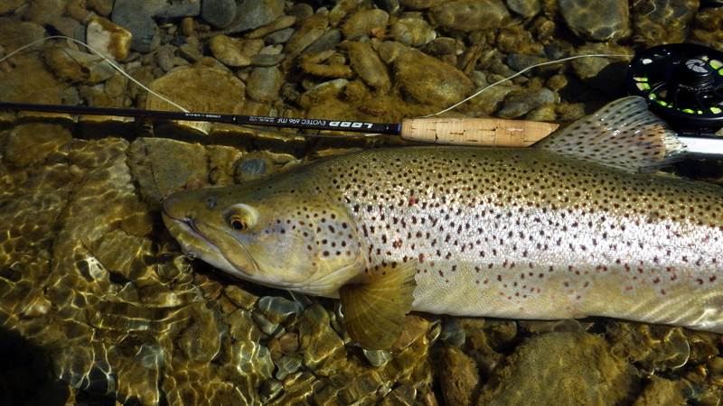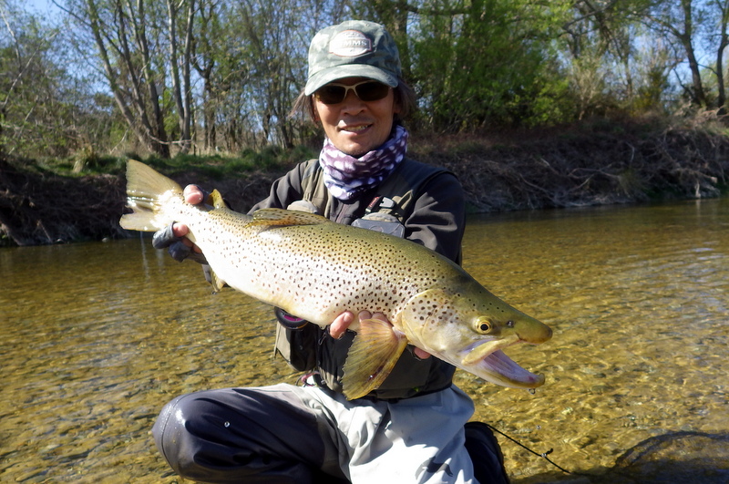 Fly Fishing 2015/10/16 Spotting the Brown さあ、解禁から2週目の日曜日です。 先週の好釣果から、行き先はもう先週と同じ川しかないでしょう。 今回は、先週やりきれなかった範囲をもう少し広く見て回りたい。 もともと、春先のこの時期にしては水が低めだからこそ選んだこの川なんですが、先週の釣行から少しずつではあるがずっと水位は下がり続けて、到着してみると う~ん、ちょっと減りすぎたな~といった感じ。 先週ファーストフィッシュが出たスポットも不発で、とりあえず釣りあがる。 途中、1匹ブラウンを見つけてアプローチするものの、フライを嫌って逃げていってしまう。 そしてこのスポットでこの日2匹目を発見した。 よし、まずフライを変えよう。 ドライ&ニンフのドライを#10スティミュレイターから#12アダムスパラシュートに。 ニンフも#12スティックカディスから#14フェザントテイルへと小さく。 背中が黒っぽく見えるけっこういいサイズ。先週の最後の魚、6.5lbと同じくらいだろう。 2投目でピッタリのレーンにフライを送り込むと、ブラウンがそっちにスッと寄って行って、前のめりに一瞬動いた。口を空けたようには見えなかったけど食ったのか!? きき気味にロッドをリフトしてみるとズシンと重さが乗った。 やっぱり食ったんだっ!! デカイっ!! ところがフライラインがリールフットの回りに絡み付いていた。 手で外すのに手間取って、ドラグが滑りだすのが一瞬遅れてしまい、 プンッっと身切れしたような感触が伝わってきて、痛恨のフックアウト~ あ~~、しまった~~、やってしまった~ いい魚だったのになあ。。 この後、同じスポットの少し下手でもう1匹を半サイトで掛けた。 魚のサイズははっきり見ていないけど、かなりのグッドファイターで小さくはなかったはず。 今度はリールファイトで問題なくやりとりしていたのに、対岸に向かって走られた時にプレッシャーをかけて寄せに転じると、またしても身切れの感触でバラシ。。 うわ~~、なんで~~ まあ、コレは仕方がないですね。ミスしたわけではないので。。 皮を薄く縫うようにフッキングしたんでしょうね。 2匹バラシてガックリしながら、釣り上がったときとは反対側のバンクを歩いてエントリーポイントに戻る。 途中、ふと目をやったバンク際で黄色い背中のいいブラウンを発見。 向こうも完全にこちらの存在に気付いて、ゆっくりバンク際を離れて沖のほうへ泳いでいく。 ただスプークしてバァーっと走っていってしまったわけではなく、ホントは日当たりのいいバンク際に居たかったんだけど、人の気配がしたから仕方なくスーッと沖に向かって動いたような感じだった。 もしかしたらまだチャンスがあるかもしれない。 ゆっくり静かに水の中に入って、徐々に岸から離れていくブラウンを目で追う。 すでにブラウンは川の真ん中を越えた辺りまで到達している。 よし1発勝負だ。 後ろのバンクには木がたくさんあるのでフォルスキャストすると引っかかる恐れがある。 普通のWFのラインだけど、水面にペリーポークでラインを畳んで、無理やりスカジットで投げた! 正直、届かないと思っていた。 ところがループは意外と伸びて、対岸に向けて泳いで離れていくブラウンを1m弱くらい超えた辺りにフライは落ちた。 そしてドライがズボッと消えた。 食ったーー!! なんと見事な1撃!自分でもビックリ!! コイツもデカイっ!! 初めは手前に向かって走ったけど、こっちの姿を見ると今度は対岸に向かって暴走。対岸のバンク際のブッシュの下に張り付くようにゆっくり上に行ったり、下に行ったり。 さっきの2回の身切れバラシが頭をよぎって怖いけど、こっちからもプレッシャーを掛けていかないと、いつまで経っても勝負が着かない。 ファイト中盤くらいで今度はフッキングがいいことを信じて、グイグイ寄せにかかる。 それでも10分以上かかったかもしれない。 ようやく無事にこの日の1匹目をランディング。 やった~、今日も仕留めることができた。 デカイし。。 6.5lb、66cm。 この川ホントにこんなのばっかりだ。恐るべし! さらに車に戻る途中、行きに攻めたけど不発だったポイントで薄っすら1匹見えているのを発見。 たぶん朝のうちはブッシュの下に入ってしまっていて、昼近くになって手前にフィーディングで出てきたんでしょう。 やっぱりいるんだなあ。 コイツも1発で食わせた! すごいキレイなジャックだ。 コレは大したサイズじゃないかと思っていたけど、ランディングしてみるとコレでも6lb、61cmある。 完璧な魚体だ。 そんなに太くはないけど、スキニーなわけでもないキレイなシェイプ。すべてのヒレも完璧だし、朱点はないけど色もいい。コレこそブラウントラウトといったモデルのような魚といっていいだろう。 自分が今まで釣ったブラウンの中でも、最もきれいな部類に入る1匹。 サイコーです。 よしよし、コレで2バラシの後2キャッチで、自分のペースは取り戻した。 ランチ休憩の後、午後の部は先週同様にも